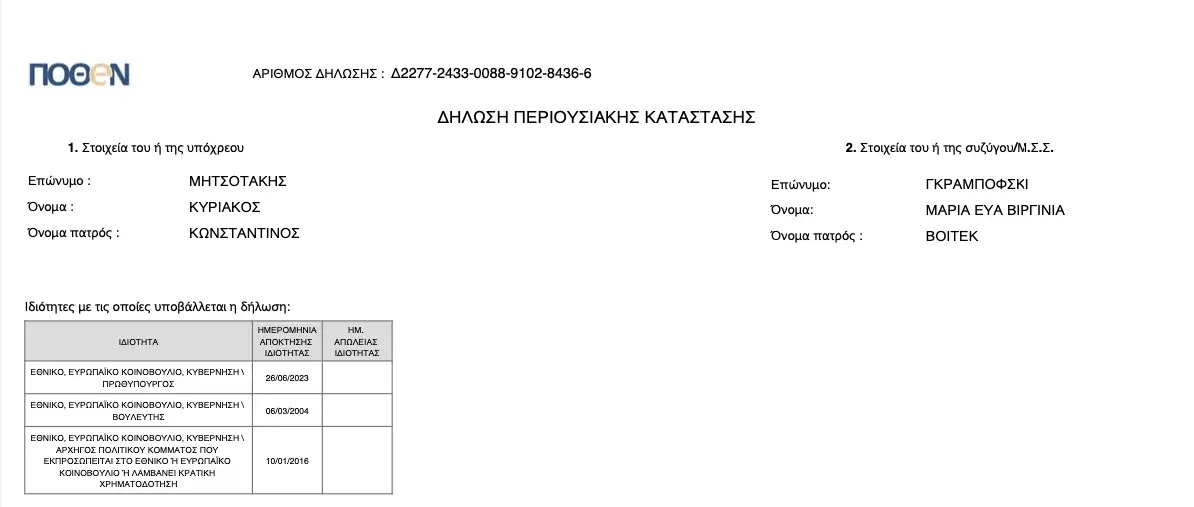 Τα πόθεν έσχες του Κυριάκου Μητσοτάκη και της συζύγου του Μαρέβας Γκραμπόφσκι για τις χρήσεις 2022 και 2023 δόθηκαν στη δημοσιότητα από τη Βουλή, παρουσιάζοντας μικρές μεταβολές σε σχέση με προηγούμενα έτη.