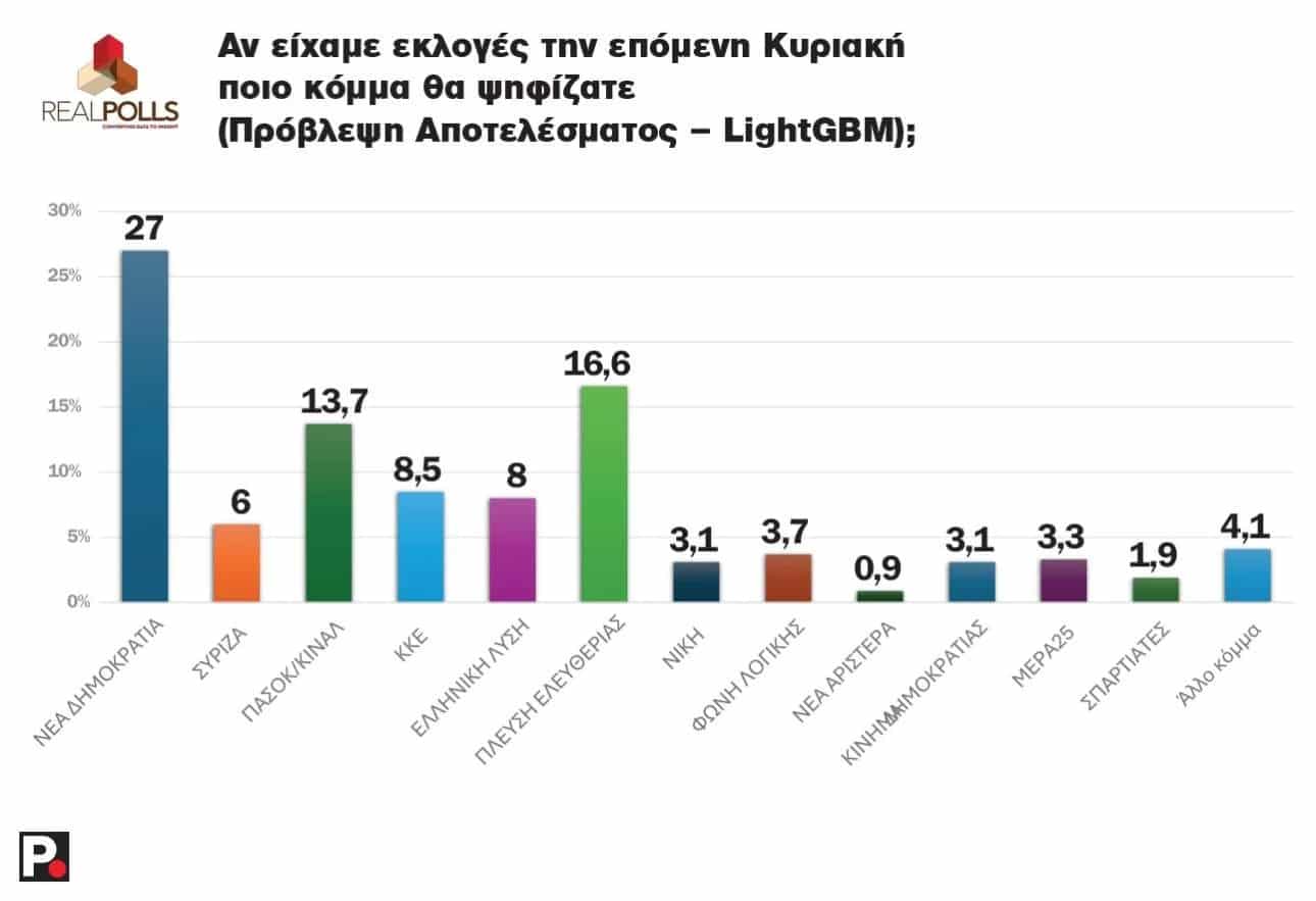 Στην πρόβλεψη αποτελέσματος, η Νέα Δημοκρατία μετρήθηκε στο 27%, πλησιάζοντας την εκλογική επίδοση του περασμένου Ιουνίου, ενώ η Πλεύση Ελευθερίας εκτιμήθηκε στο 16,6% – ένα εντυπωσιακό ποσοστό, ακόμα και αν πρόκειται για αυτό που συνηθίζουμε να λέμε «φωτογραφία της στιγμής». Στην τρίτη θέση, κοντά στην επίδοση των ευρωεκλογών, με 13,7 %, εκτιμήθηκε το ΠΑΣΟΚ-ΚΙΝΑΛ, ενώ ακολουθούν ΚΚΕ με 8,5%, Ελληνική Λύση με 8% και ΣΥΡΙΖΑ με 6%. Κοντά στην περιοχή του 3% βρίσκονται τέσσερα κόμματα: Φωνή Λογικής (3,7%), ΜέΡΑ25 (3,3%), Νίκη (3,1%) και Κίνημα Δημοκρατίας (3,1%).