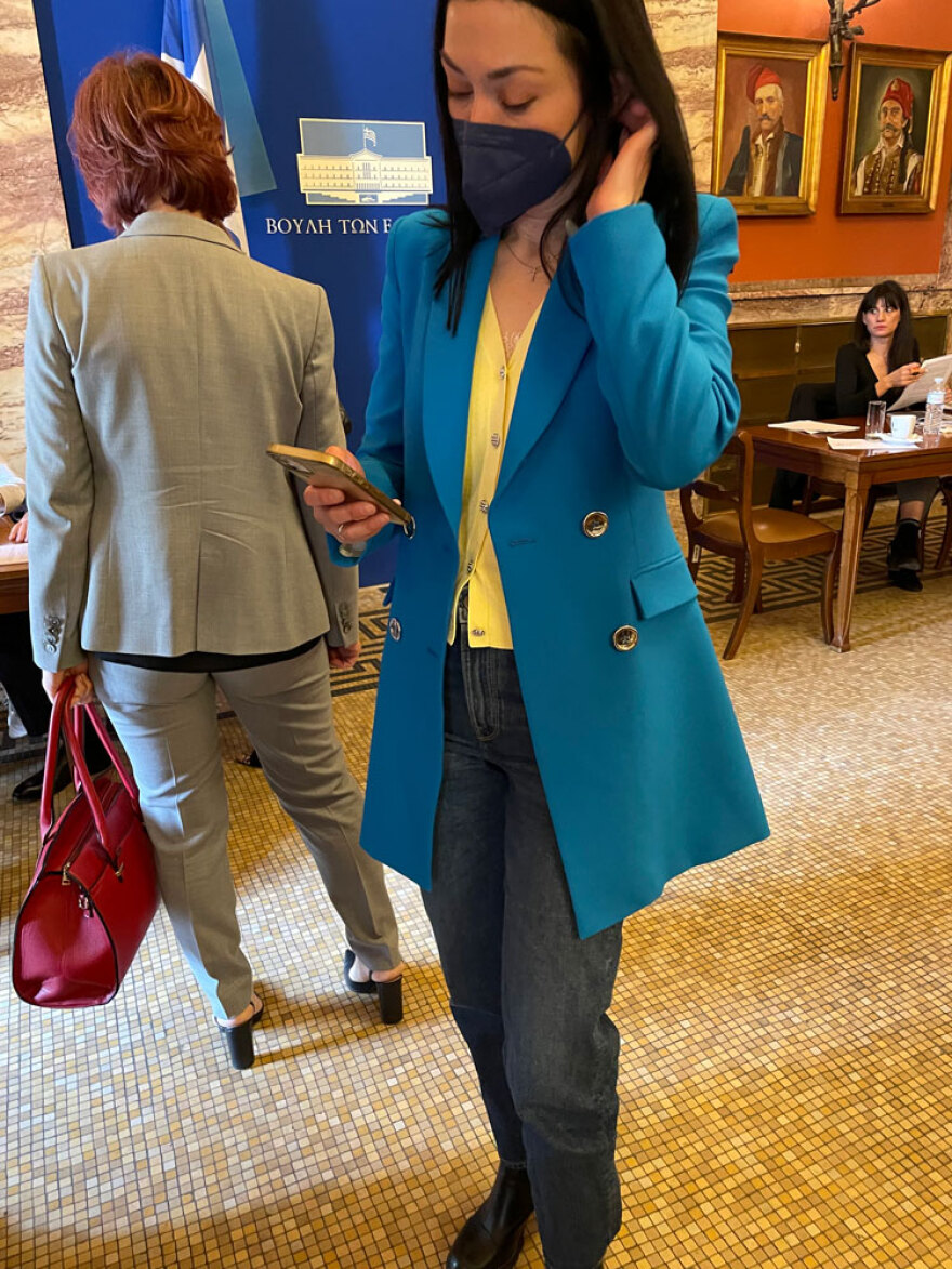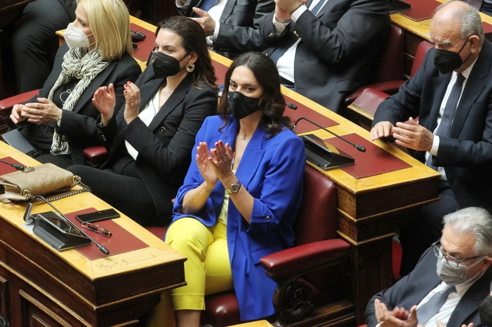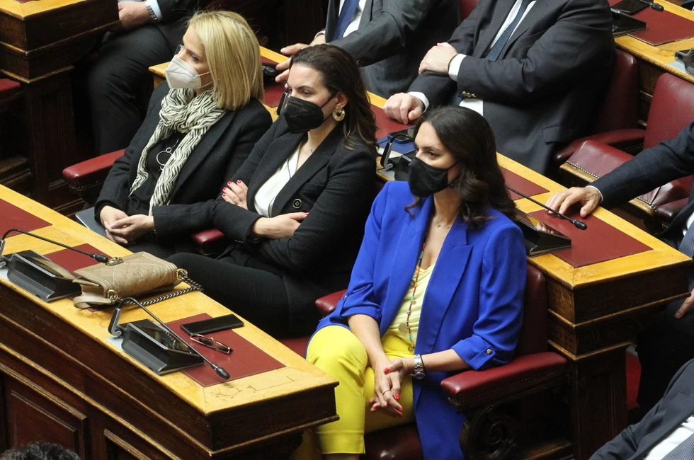 Βουλή: Με τα χρώματα της Ουκρανίας εμφανίστηκαν η βουλευτής της Νέας Δημοκρατίας, Νόνη Δούνια και η βουλευτής του ΚΙΝΑΛ, Νάντια Γιαννακοπούλου, χθες, Πέμπτη, κατά την ομιλία του προέδρου της Ουκρανίας, Βολοντίμιρ Ζελένσκι.