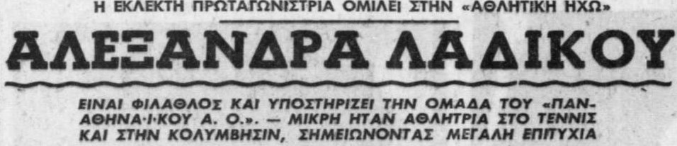 «Πάντα μ’ ενδιέφερε και μ’ ενδιαφέρει ο αθλητισμός. Προσωπικά παλιότερα έπαιζα τένις και σαν ερασιτέχνης, βέβαια, ασχολούμαι πάντα με την κολύμβηση. Ως θεατής όταν μου μένει καιρός παρακολουθώ κάθε αθλητική εκδήλωση, από τον στίβο μέχρι το ποδόσφαιρο», ήταν τα λόγια της Αλεξάνδρας Λαδικού.