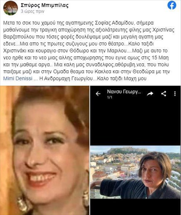 Την είδηση έκανε γνωστή μέσα από τον προσωπικό του λογαριασμό στο facebook ο πρόεδρος του Σωματείου Ελλήνων Ηθοποιών, Σπύρος Μπιμπίλας.