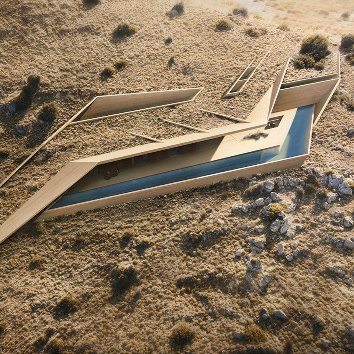 Η Casa Katana μοιάζει σαν μια χαραγματιά στην άγονη γη του Κρητικού Νότου. Σχεδιασμένη από τον αρχιτέκτονα Κωνσταντίνο Σταθόπουλο του KRAK. architects, αυτή η τεθλασμένη εξοχική κατοικία που θα χτιστεί σε μια απόμερη πλαγιά με μαγευτική θέα στο Λιβυκό πέλαγος, είναι σαν διαστημικός σταθμός σε κάποια άγονη έκταση ενός μακρινού πλανήτη όπως ο Άρης.