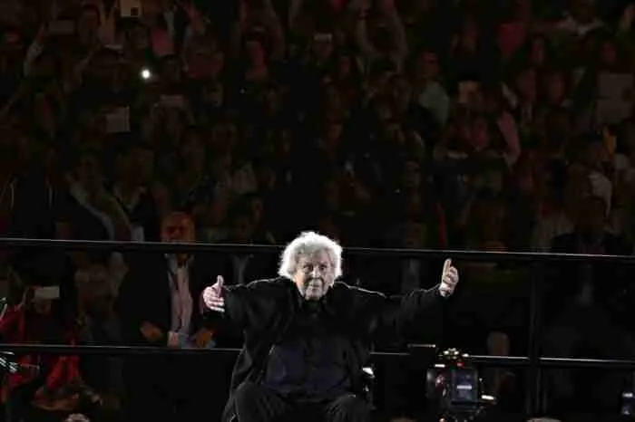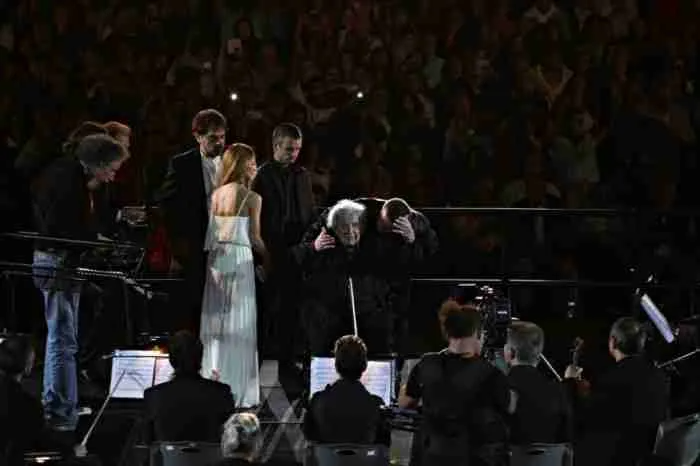 Ο μεγάλος συνθέτης, παρά το προχωρημένο της ηλικίας του, ζήτησε όχι απλώς να παρίσταται, αλλά και να διευθύνει το φινάλε της συναυλίας και αποθεώθηκε από τον κόσμο που παραβρέθηκε στο Καλλιμάρμαρο Στάδιο.