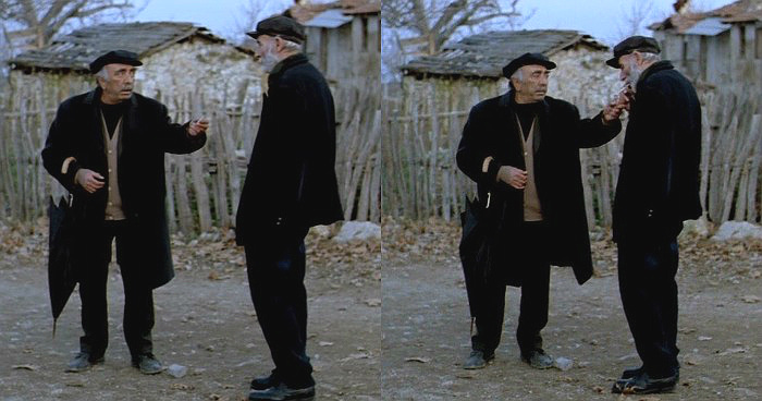 Οι δύο ηθοποιοί συναντιούνται στον δρόμο του χωριού, ανταλλάζουν ένα τσιγάρο και ακολουθεί ο εξής συγκλονιστικός μονόλογος του Παπαγιαννόπουλου:
