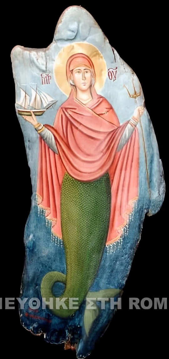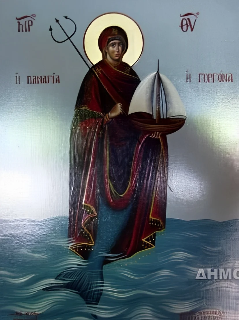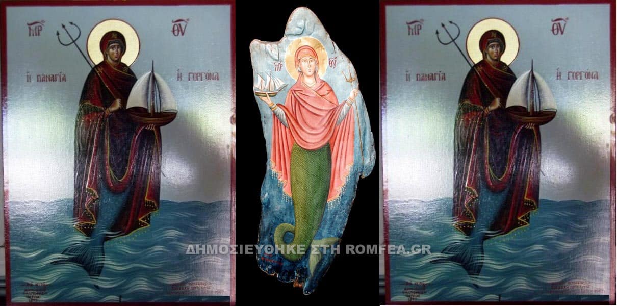 Εκεί βρίσκεται και η εικόνα της Παναγίας η οποία δεν εικονίζεται όπως την έχουμε γνωρίσει από τις γνωστές απεικονίσεις της, αλλά ως γοργόνα! Στην εικόνα αυτή, η Παναγία εμφανίζεται με ανθρώπινη μορφή από την μέση και πάνω ενώ από την μέση και κάτω, έχει σώμα ψαριού όπως ακριβώς δηλαδή και οι γνωστές γοργόνες της μυθολογίας. Κανείς δεν ξέρει τι ήταν αυτό που οδήγησε τον άγνωστο λαϊκό καλλιτέχνη στο να απεικονίσει την Παναγία ως γοργόνα.
