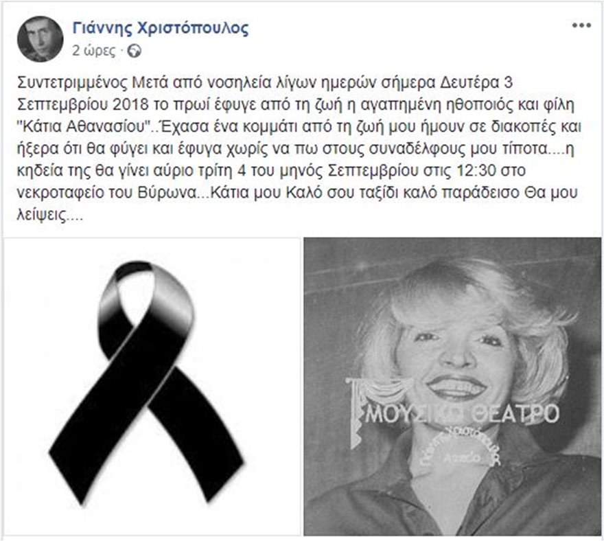 Συγκεκριμένα είχε γράψει στο Facebook το 2018: «Συντετριμμένος Μετά από νοσηλεία λίγων ημερών σήμερα Δευτέρα 3 Σεπτεμβρίου 2018 το πρωί έφυγε από τη ζωή η αγαπημένη ηθοποιός και φίλη “Κάτια Αθανασίου”.Έχασα ένα κομμάτι από τη ζωή μου ήμουν σε διακοπές και ήξερα ότι θα φύγει και έφυγα χωρίς να πω στους συναδέλφους μου τίποτα….η κηδεία της θα γίνει αύριο τρίτη 4 του μηνός Σεπτεμβρίου στις 12:30 στο νεκροταφείο του Βύρωνα…Κάτια μου Καλό σου ταξίδι καλό παράδεισο Θα μου λείψεις».