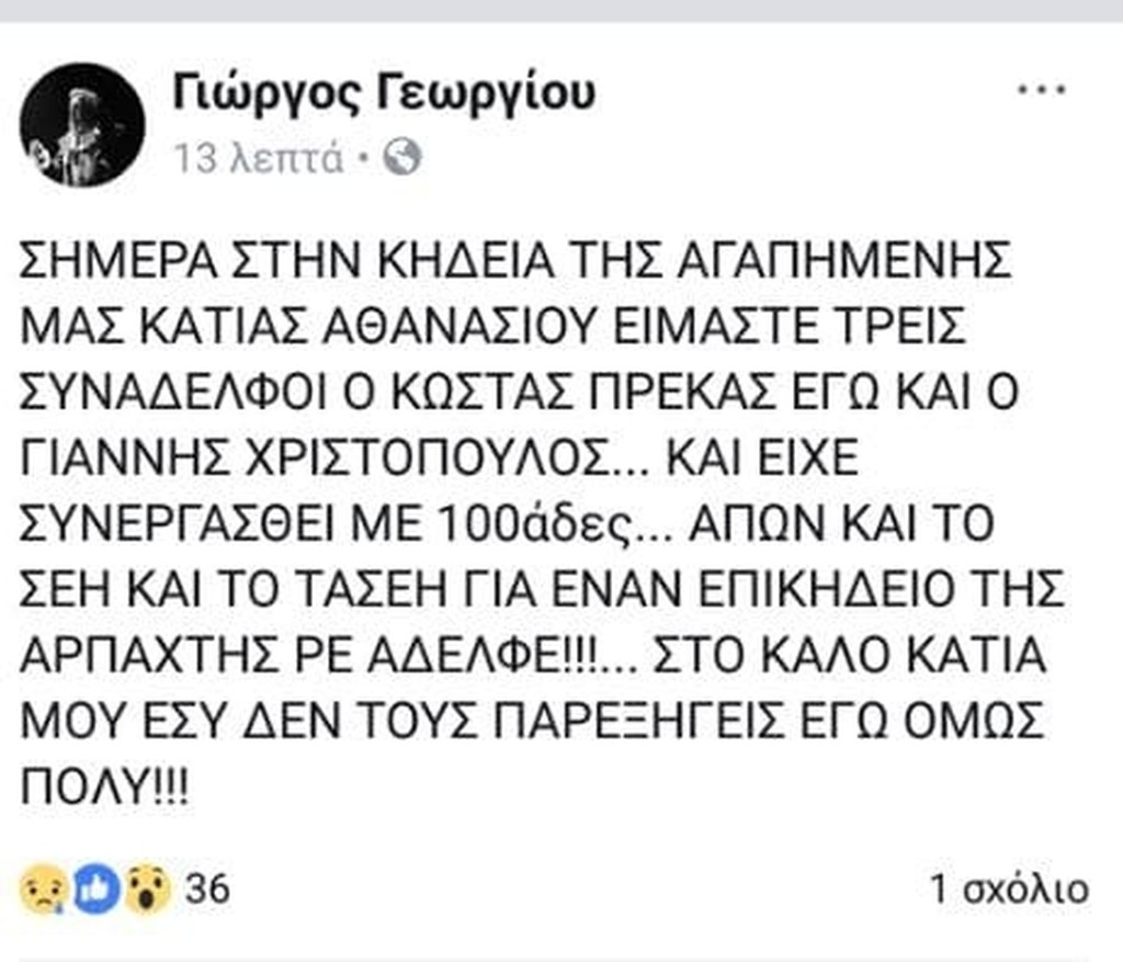 Το παράπονό του εξέφρασε μέσω ανάρτησής του στο Facebook, ο ηθοποιός Γιώργος Γεωργίου, καθώς παρά το γεγονός ότι η Κάτια Αθανασίου είχε συνεργαστεί με πολλούς ηθοποιούς καθ’ όλη τη διάρκεια της καριέρας της, μονάχα τρεις βρέθηκαν στο «τελευταίο αντίο» για εκείνη.