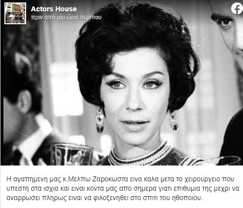 «Η αγαπημένη μας κ. Μέλπω Ζαροκωστα είναι καλά μετά το χειρουργείο που υπέστη στα ισχία και είναι κοντά μας από σήμερα γιατί επιθυμία της μέχρι να αναρρώσει πλήρως είναι να φιλοξενηθεί στο σπίτι του ηθοποιού», έγραφε τότε η εν λόγω ανακοίνωση.