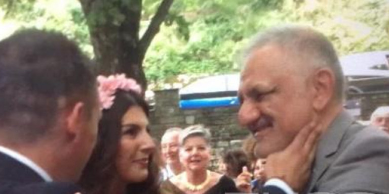 Με τη συνοδεία του γνωστού τραγουδιού «Σήμερα γάμος γίνεται», ο τραγουδοποιός παρέδωσε την κόρη του στον γαμπρό Σπύρο Αγγελόπουλο.