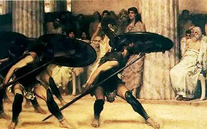 Σύμφωνα με τον Αριστοτέλη και τον Όμηρο, ο πολεμικός χορός Πυρρίχιος ήταν ένοπλος χορός. Ο οποίος χορευόταν από παιδιά, άντρες αλλά και γυναίκες. Περιείχε στροφές στα πλάγια, οπισθοχωρήσεις, πηδήματα. Και χαμηλώματα, επιθετικές κινήσεις και κινήσεις άμυνας και οι χορευτές έβγαζαν ζωηρές φωνές.