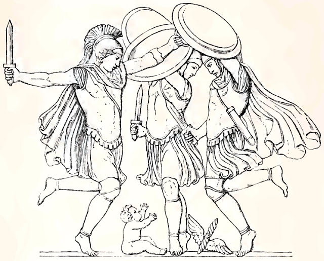 Στα αρχαία κείμενα αναφέρεται ότι οι χορευτές ήταν παρατεταγμένοι σε στρατιωτική διάταξη, κρατούσαν ασπίδα και δόρυ και μιμούνταν κινήσεις στρατιωτών σε ώρα μάχης.