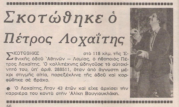Τον Μάιο του 1976 ο Πέτρος Λοχαΐτης κατευθυνόταν προς τον Θεολόγο με το αυτοκίνητο του, όταν για άγνωστο λόγο έχασε τον έλεγχο και έπεσε πάνω σε ένα βράχο. Η σύγκρουση ήταν πολύ δυνατή και μοιραία για τον ηθοποιό.