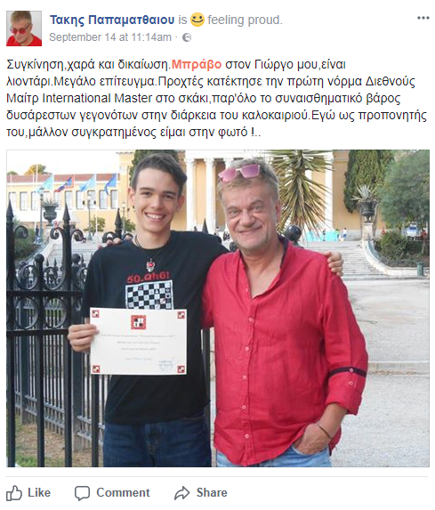 “Συγκίνηση,χαρά και δικαίωση.Μπράβο στον Γιώργο μου,είναι λιοντάρι.Μεγάλο επίτευγμα.Προχτές κατέκτησε την πρώτη νόρμα Διεθνούς Μαίτρ International Master στο σκάκι,παρ’όλο το συναισθηματικό βάρος δυσάρεστων γεγονότων στην διάρκεια του καλοκαιριού.Εγώ ως προπονητής του,μάλλον συγκρατημένος είμαι στην φωτό!”, είχε γράψει χαρακτηριστικά στη λεζάντα που την συνόδευε.