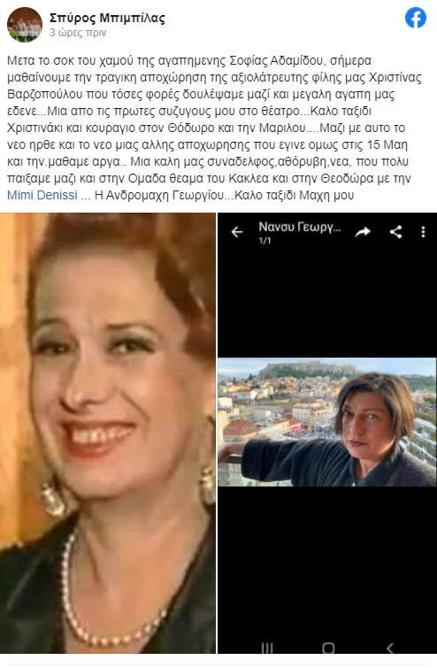 Δύσκολες στιγμές βιώνει αυτήν την περίοδο ο γνωστός ηθοποιός Θόδωρος Κατσαφάδος, καθώς έφυγε από τη ζωή σε ηλικία 73 ετών η ηθοποιός και σύζυγος του Χριστίνα Βαρζοπούλου. Την είδηση του θανάτου της γνωστής ηθοποιού γνωστοποίησε ο Σπύρος Μπιμπίλας με ανάρτηση του στο Facebook. Μαζί, είχαν αποκτήσει μια κόρη, την Μαριλού, που είναι και αυτή ηθοποιός.