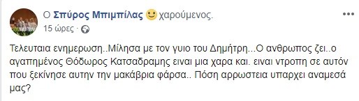 Ωστόσο, ο ηθοποιός Θεόδωρος Κατσαδράμης παρά το προχωρημένο της ηλικίας του (σ.σ. 91 ετών) είναι υγιής στο σπίτι του, έχοντας κοντά του τον γιο του Δημήτρη. Μάλιστα ο πρόεδρος του ΤΑΣΕΗ Σπύρος Μπιμπίλας με μια έντονη ανάρτησή του στο προσωπικό του προφίλ στο FB διέψευσε την φήμη θανάτου του σπουδαίου ηθοποιού!