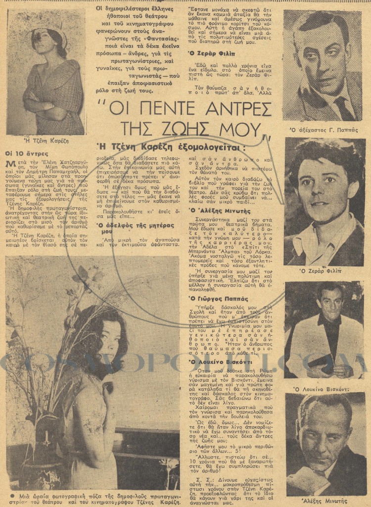 Η Τζένη Καρέζη σε ηλικία 25 χρονών, το 1961, ήταν ήδη μία από τις δημοφιλέστερες ηθοποιούς, τόσο του θεάτρου, όσο και του κινηματογράφου και σε συνέντευξή της στο περιοδικό “Φαντασία”, αποκάλυψε τους πέντε άντρες της ζωής της, πριν τον Κώστα Καζάκο.
