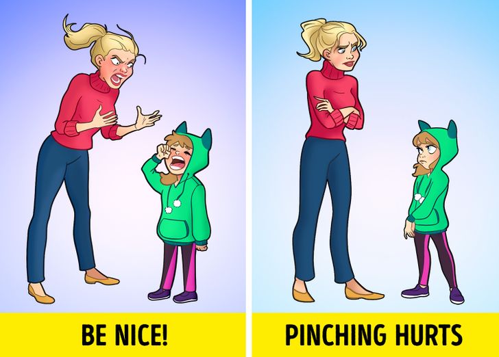 Αποφύγετε να υποθέσετε ότι ένα παιδί γνωρίζει ποιο ήταν το λάθος του ή τι εννοείτε όταν λέτε «να παίζετε ωραία». Να είστε ακριβείς για το τι είναι λάθος και γιατί. Ένα απλό «μην τσιμπάς τον αδερφό σου, πονάει» λειτουργεί.