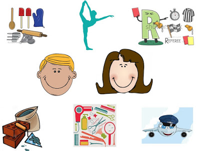 Το δεύτερο μέρος του μαθήματος είχε να κάνει με τα επαγγέλματα. Τους μοίρασε κόλλες με τις παρακάτω εικόνες ζητώντας να αντιστοιχίσουν τα αντικείμενα που αντιπροσωπεύουν διάφορα επαγγέλματα με το πρόσωπο που τα εξασκεί. (άντρας ή γυναίκα). Πριν προλάβει να το διευκρινίσει, ένα αγοράκι την ρώτησε «Κι αν κάποιο το κάνουν και οι δύο;» «Θα το αντιστοιχίσετε και με τους δύο». Όσο εξηγούσε τη δραστηριότητα δεν κατονόμασε τα επαγγέλματα για να μη δώσει «φύλο» στις λέξεις και τα προϊδεάσει. (π.χ. Αυτά τα αντικείμενα έχουν να κάνουν με τη μαγειρική, αυτά με το χτίσιμο κτλ). Για τον ίδιο λόγο επέλεξε μόνο αντικείμενα και όχι ανθρώπινες φιγούρες. (εκτός από το μπαλέτο που όσα αντικείμενα βρήκα παρέπεμπαν σε γυναίκα.)