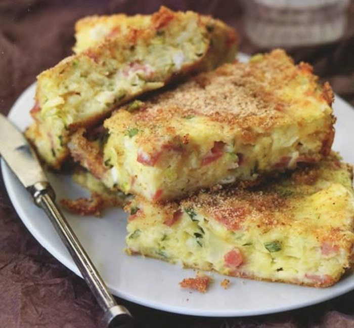 Στη συνέχεια πρέπει να τρίψει τα κολοκυθάκια. Έπειτα, να ψιλοκόψει το κρεμμύδι και το σκόρδο. Μετά πρέπει να πάρει ένα μπολ και να βάλει μέσα τα αυγά για να τα χτυπήσει. Παράλληλα, οφείλει να αλατοπιπερώσει, να βάλει ελαιόλαδο, τυριά, ζαμπόν και να ανακατέψει, βάζοντας ακόμη και αλεύρι.