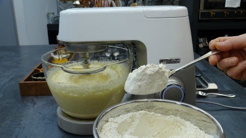 -Χαμηλώνουμε την ταχύτητα της κουζινομηχανής και λίγο-λίγο ρίχνουμε το αλεύρι με το baking.