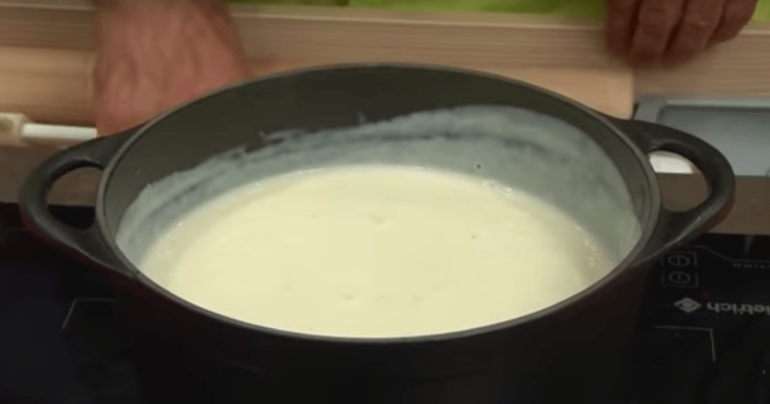 2. Στη συνέχεια ζεστάνετε βράστε γάλα και έπειτα ρίξτε το στο τηγάνι, ανακατεύοντάς το. Μετά, ρίξτε λίγο αλάτι και κύμινο.