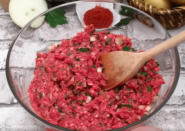 3. Βάλτε τον φούρνο να προθερμανθεί στους 200 βαθμούς Κελσίου. Στη συνέχεια πάρτε ένα μπολ και ρίξτε μέσα τον κιμά, το κρεμμύδι, τον μαϊντανό, την πάπρικα, λίγο αλάτι και πιπέρι. Έπειτα, ανακατέψτε μέχρι να γίνει μείγμα.