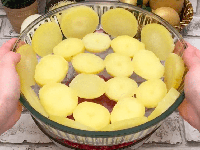 4. Βράστε πατάτες μέχρι να μαλακώσουν και μετά βάλτε τις πατάτες στα τοιχώματα και στον πάτο του πυρέξ.