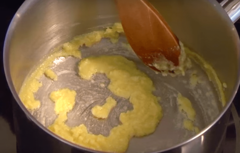 1. Αρχικά, πρέπει να φτιάξετε τη μπεσαμέλ. Λιώστε το βούτυρο σε ένα τηγάνι, βάζοντάς το σε μέτρια φωτιά. Βάλτε αλεύρι και ανακατέψτε μέχρι να πάρει χρυσαφί χρώμα.