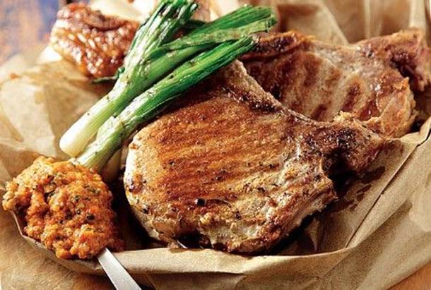 – 6 χοιρινά μπριζολάκια. – 10-12 φρέσκα κρεμμυδάκια ολόκληρα. – Αλάτι, πιπέρι, ελαιόλαδο. – 2 ψητές κόκκινες πιπεριές. – 1 σκελίδα σκόρδο πολτοποιημένη. – 1/4 φλ. τσαγιού καβουρντισμένα αμύγδαλα.