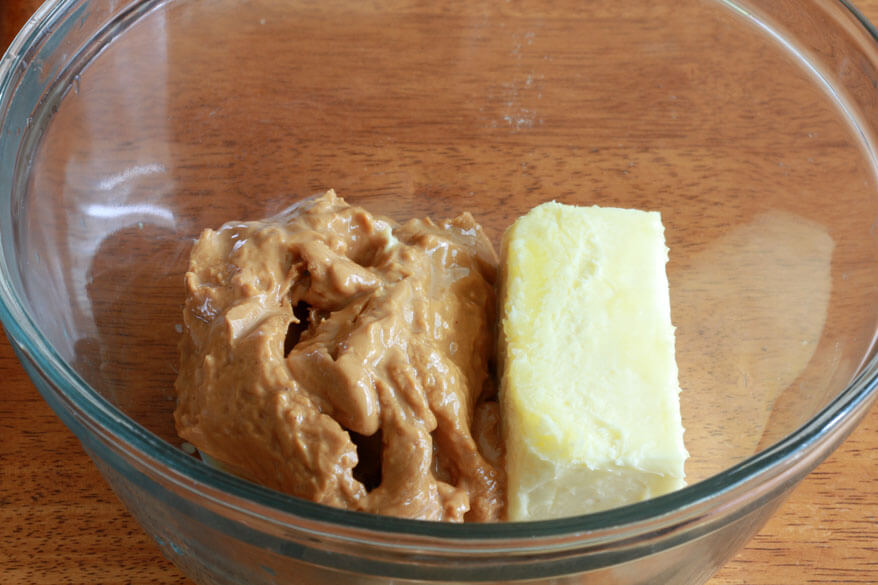 1. Με ένα μίξερ ή μία κουτάλα ανακατέψτε το φυστικοβούτυρο, με το βούτυρο. Χρειάζεται καλό ανακάτεμα για να έχουν την υφή από κρέμα. Έπειτα, προσθέστε βανίλια.