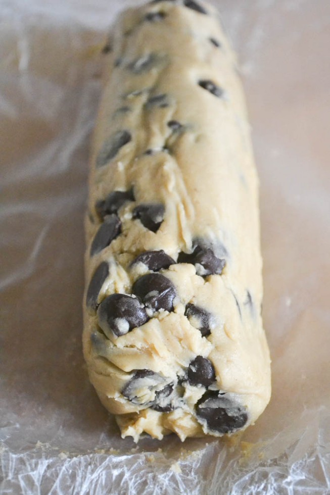3. Βάλτε σταγόνες σοκολάτας. Έπειτα, βάλτε τη ζύμη σε ένα φύλλο ψησίματος. Φτιάξτε τη ζύμη σε σχήμα κορμού, το οποίο θα τυλίξετε με χαρτί. Κλείνετε καλά τις άκρες. Στη συνέχεια, ο κορμός σας, ο οποίος είναι περίπου 20 εκατοστά, πρέπει να παγώσει στο ψυγείο.