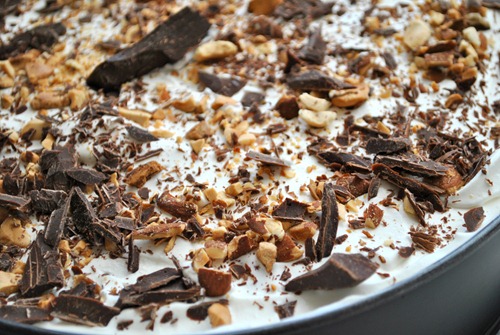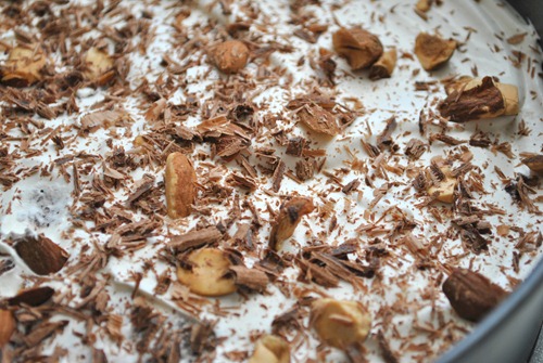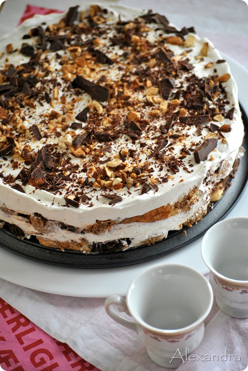 Φτιάχνουμε τη δεύτερη στρώση, η οποία αποτελείται από μπισκότα, πραλίνα, σαντιγί, σοκολάτα και αμύγδαλα.