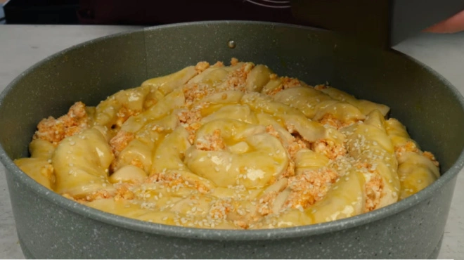 11ο βήμα: Αλείφουμε τον κρόκο του αυγού και πασπαλίζουμε, με σουσάμι.