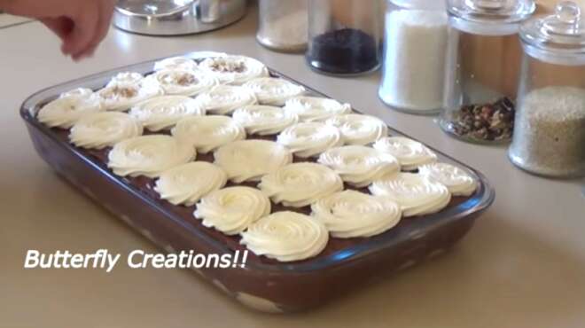 Βίντεο με οδηγίες για την εκτέλεση της συνταγής για γλυκό ψυγείου, με πραλίνα, μπισκότα και κρέμα γάλακτος: