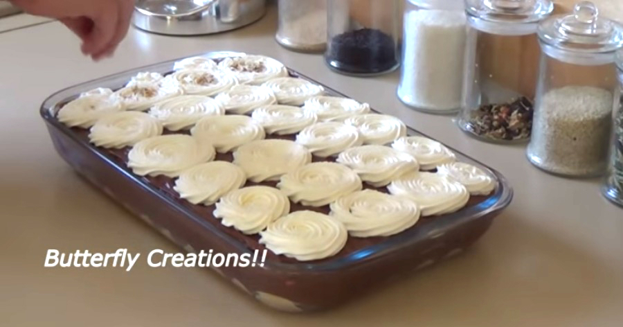 Εκτέλεση συνταγής για γλυκό ψυγείου, με πραλίνα, μπισκότα και κρέμα γάλακτος: