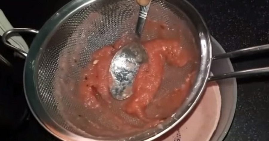Στη συνέχεια, πάρε ένα βαθύ μπολ και βάλε από πάνω το σουρωτήρι. Πέρνα τον πολτό σου για να μείνει μόνο ο χυμός και να αποφύγεις το παγωτό να έχει κουκούτσια.