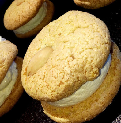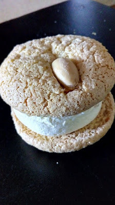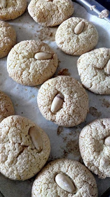 Βάζουμε τη ζύμη σε κορνέ και τοποθετούμε στο ταψί με λαδόκολλα δισκάκια στα οποία βάζουμε ένα αμύγδαλο στο πάνω μέρος. Ψήνουμε για 20 λεπτά στους 180 βαθμούς.