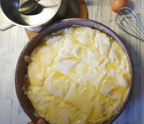 – Περιχύνουμε την πίτα με το μείγμα μας.