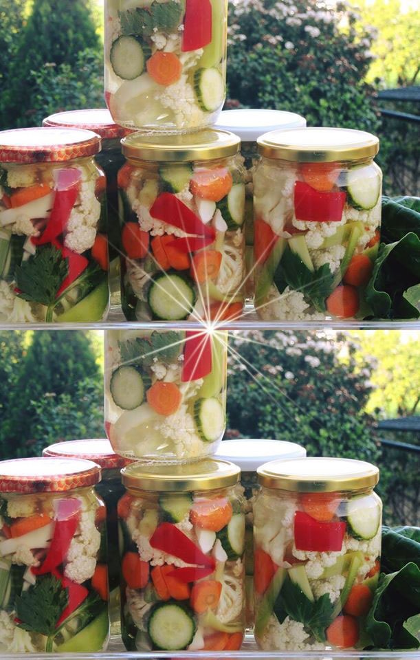 – Αποστειρώνουμε καλά τα βάζα και τα καπάκια μας. – Βράζουμε καλά τα βάζα και τα καπάκια μας σε καυτό νερό για περίπου πέντε λεπτά. – Πλένουμε δυο φορές καλά τα λαχανικά σε αλατισμένο νερό. – Σε μια κατσαρόλα ρίχνουμε 1 λίτρο νερό. – Επιπλέον, ρίχνουμε 1 λίτρο ξύδι λευκό, το αλάτι, τη ζάχαρη, καθώς και την καυτερή πιπεριά κομμένη σε λεπτές φέτες. – Βράζουμε τα υλικά μας για περίπου πέντε λεπτά. – Βάζουμε στα βάζα τα λαχανικά ωμά. Προσθέτουμε το ξυδόνερο. Απλά το ξυδόνερο να είναι χλιαρό έως κρύο για να τα σκεπάσει μέχρι επάνω. – Προσθέτουμε λίγο πριν το τέλος της διαδικασίας, λίγο λαδάκι. – Κλείνουμε καλά, το βάζο μας για χρονικό διάστημα ενός μηνός.