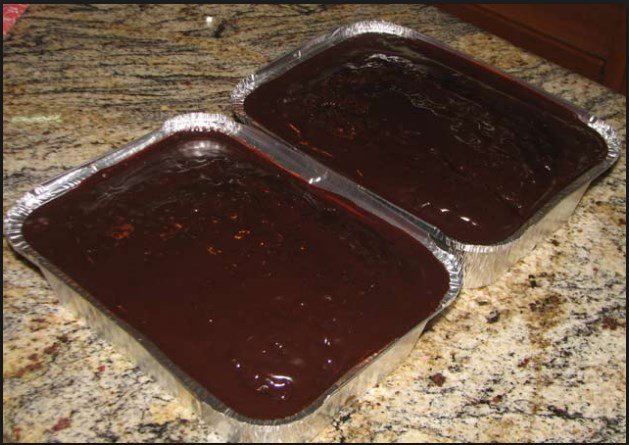 – Βάζουμε μείγμα από σοκολατόπιτα στη φόρμα, με το κέικ μας.
