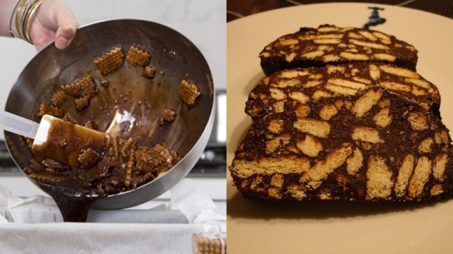 – Ρίξτε στο μείγμα με το βιτάμ, τα σπασμένα μπισκότα.