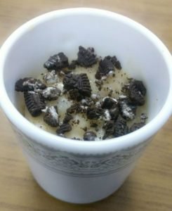 – Αφού ανακατέψεις καλά, βάλε την κούπα στον φούρνο για 1.5 λεπτό και στο τέλος πρόσθεσε μερικά τριμμένα μπισκότα Oreo.