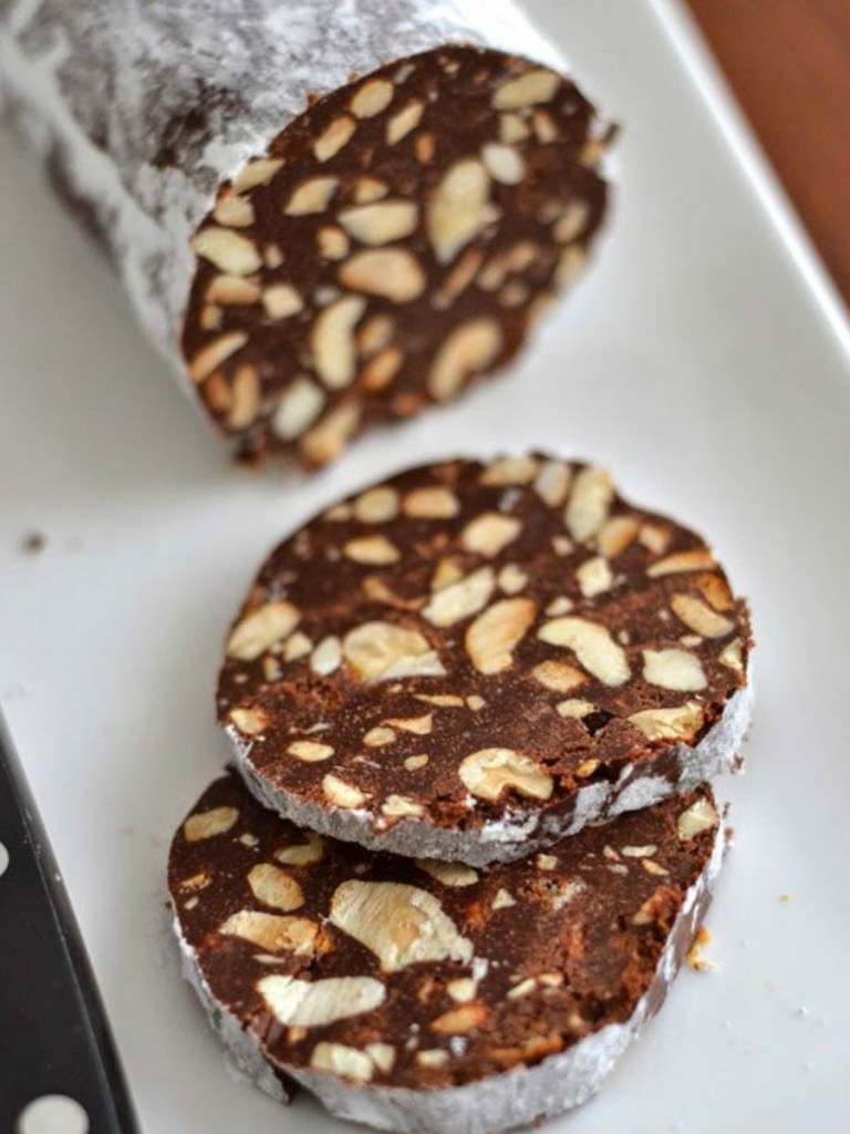 - Ρίξτε το μείγμα σε ένα κομμάτι αντικολλητικό χαρτί και δώστε του μακρόστενο σχήμα. Τυλίξτε καλά και βάλτε τον κορμό στην κατάψυξη μέχρι να ομογενοποιηθεί.Όταν περάσει το δίωρο στην κατάψυξη το μεταφέρετε στο ψυγείο και είναι έτοιμο για κόψιμο.