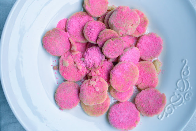 – Χτυπάμε για δέκα λεπτά το βούτυρο με τη ζάχαρη και προσθέτουμε σταδιακά το αλεύρι και τα αμύγδαλα. Πλάθουμε σε μικρά κουλουράκια και ψήνουμε σε προθερμασμένο φούρνο, στους 170 για 22 λεπτά. Όταν ψηθούν τους αφήνουμε να κρυώσουν και τους βουτάμε στη ροζ ζάχαρη.