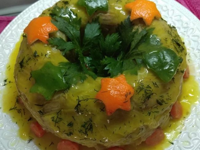 – Στρωνουμε μερικά φύλλα λάχανο στον πάτο από μια φόρμα του κέικ.