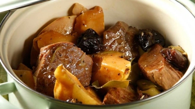 – Βάζουμε τα δαμάσκινα και τα βερίκοκα δεξιά και αριστερά στην πιατέλα με το κρέας, το οποίο έχει κοπεί ήδη σε φέτες.