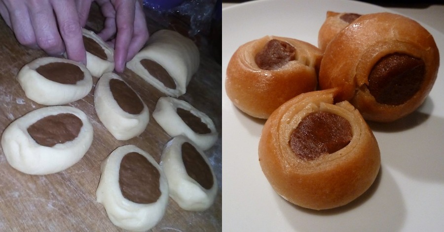 – Όποτε παίρνουμε ζύμη από κακάο την κάνουμε κορδόνι, την τοποθετούμε στην άκρη του φύλλου, το ρολάρουμε και κόβουμε ίσα κομμάτια.