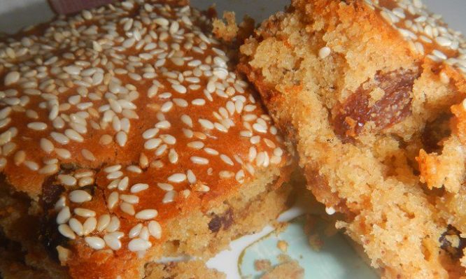 4. Ραντίζετε με λίγο νεράκι, ρίχνετε το σουσάμι και ψήνετε στους 170-180 βαθμούς για 40 λεπτά. Αφού κρυώσει, κόβετε σε τετράγωνα ή διαγώνια κομμάτια. Αν δε βάλετε σουσάμι, μπορείτε να πασπαλίσετε με λίγη ζάχαρη άχνη για πιο όμορφο αποτέλεσμα. Διατηρείτε σε αεροστεγές κουτί για πολλές μέρες.