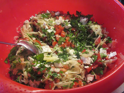 2ο βήμα: Ψιλοκόβουμε καλά τις ντομάτες, τα κρεμμύδια, την πατάτα, το τυρί και όλα τα υπόλοιπα μυρωδικά.
