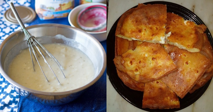 – Χτυπάμε με σύρμα, τα αυγά, με το γάλα. – Βάζουμε αλάτι και πιπέρι. – Προσθέτουμε λίγο – λίγο, το αλεύρι. Σκοπός είναι να γίνει σαν χυλός. (σ.σ. δηλαδή όπως στις τηγανίτες). – Σπάμε με τα χέρια μας, το τυρί. – Προθερμαίνουμε το φούρνο μας στους 200 βαθμούς Κελσίου. – Βάζουμε λάδι στο ταψί μας. – Τοποθετούμε στο φούρνο για να κάψει καλά. – Προσθέτουμε τον χυλό. – Ψήνουμε ανάλογα, με τον φούρνο, μέχρι να πάρει, το επιθυμητό χρώμα.